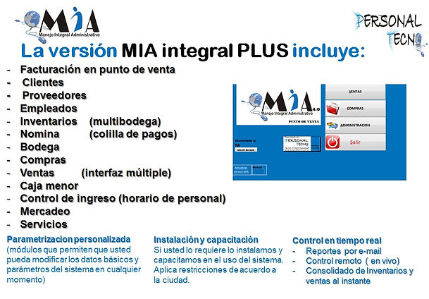M.I.A. MANEJO INTEGRAL ADMINISTRATIVO Es una herramienta para el manejo administrativo de cualquier tipo de empresa o negocio, sea comercial, o de servicios tanto para ventas a gran escala, como para puntos de venta, es completamente personalizable y adaptable, a cualquier necesidad, lo cual lo hace una excelente herramienta de control con la cual se puede direccionar desde los procesos más pequeños hasta operaciones complicadas.